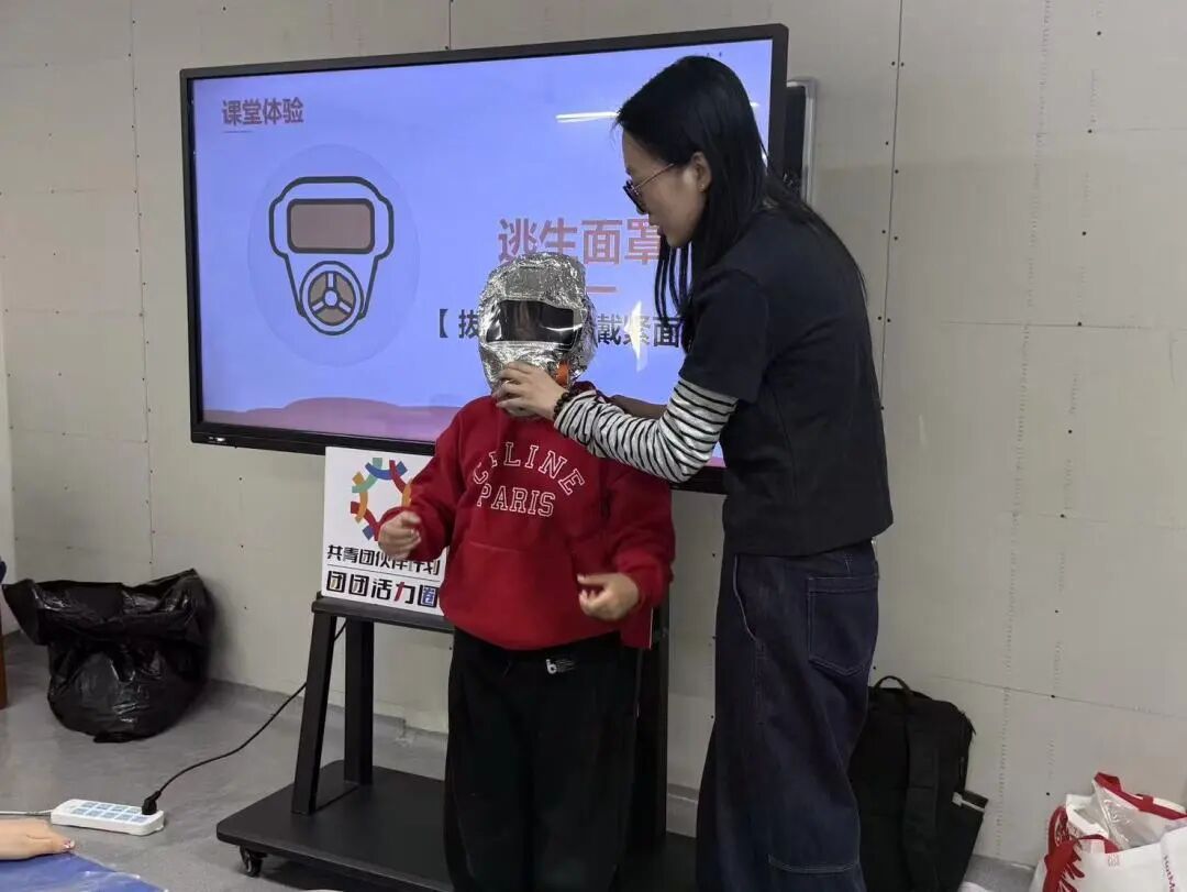 活动中,老师以趣味实验开场,用玻璃杯子隔绝蜡烛,观察到火焰逐渐熄灭,快速调动现场氛围。用视频案例,引导出火灾“蔓延快、烟雾有毒、温度高、容易迷失方向”四大特点,以及如何提前做好准备。重点强调火灾中有毒烟雾的危害,现场示范并给同学们体验防毒面具的用法。同学们积极参与,主动抢答,教育效果显著。